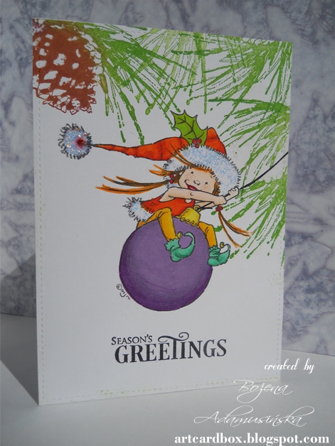 Wykorzystałam digi stamp od Mo's, który pomalowałam Promarkerami. Podoba mi się aksamitny efekt jaki udało mi się uzyskać na bombce. zbyt dużo wolnego niejsca od góry karty wypełniłam stemplem Penn Black. Musiałam zamaskować obraz digi, ale efekt końcowy podoba mi się.
